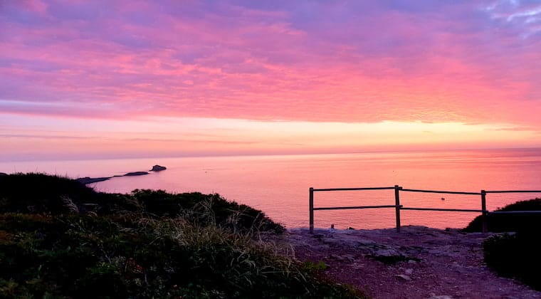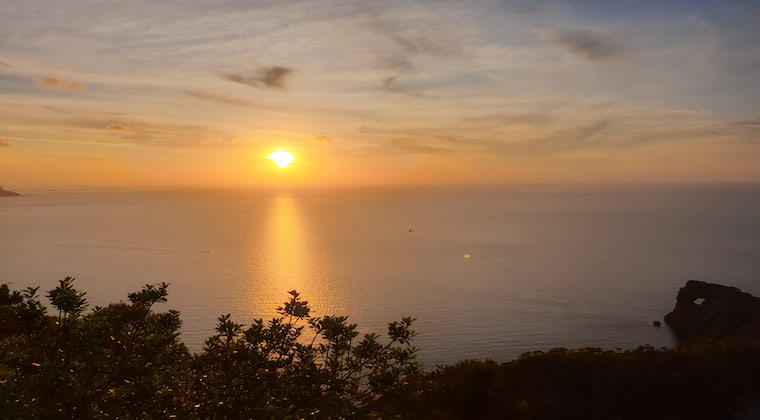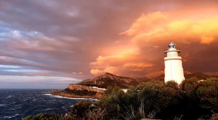 Ein Tipp für die schönsten Sonnenuntergänge auf Mallorca ist das Cap Gros. Der 160 Jahre alte Leuchtturm gibt noch heute Lichtsignale ab. Von Port de Sóller läuft man eine halbe Stunde, etwa 3 Kilometer weit, eine kleine Steigung nach oben. Oberhalb gibt es auch einige Parkplätze, falls du lieber mit dem Auto oder Roller fährst. Der Ausblick von oben ist wunderschön: auf die Hafenbucht von Port de Sóller, das Meer, die schroffe Küste oder auf die Berge im Hinterland.