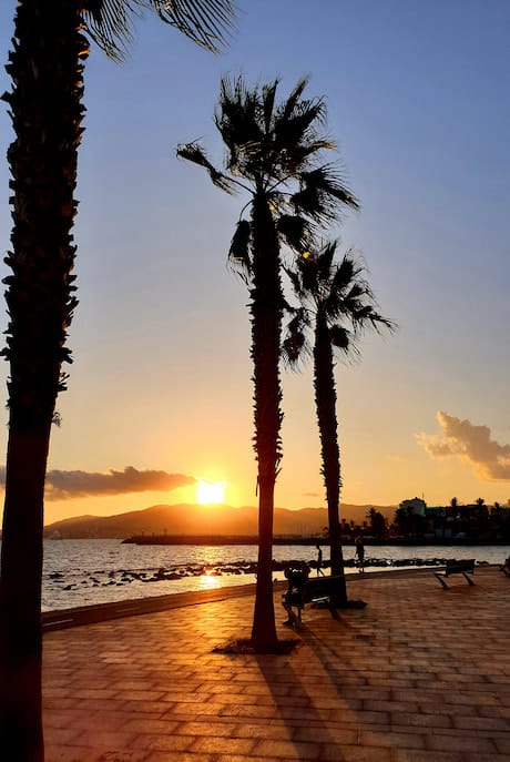 rnrnrnrnrnDas ist die Playa de Palma: Auf Höhe Balneario 9 hast du einen wunderschönen Blick auf den Sonnenuntergang hinter den Hügeln Palmas. In der Ferne siehst du den Fähren und Kreuzfahrtschiffe beim Ein-u0026 Auslaufen in Palmas Hafen zu.