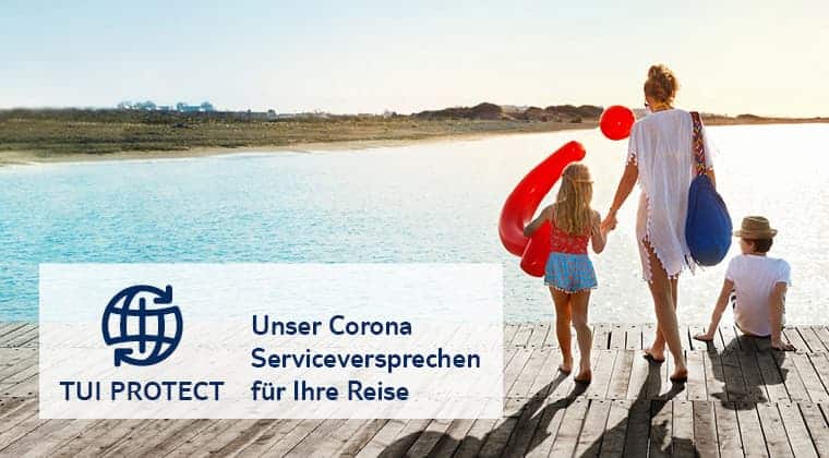 * Das TUI PROTECT Service Versprechen gilt für alle Anreisen vom 01.11.2021 bis 31.10.2023 für alle Pauschalreisen, Hotelbuchungen sowie Rundreisen der TUI Deutschland GmbH inkl. der Marken XTUI, LTUR und airtours sowie für Buchungen von Fly&Mix. (Ausgeschlossen sind die Produkte von TUI Cars, TUI Camper, TUI Ticket Shop, Veranstaltungstickets, VERS[4u], TUI Villas, atraveo, TUI Cruises, airtours private travel und Nur- Flug Buchungen über TUI.com).