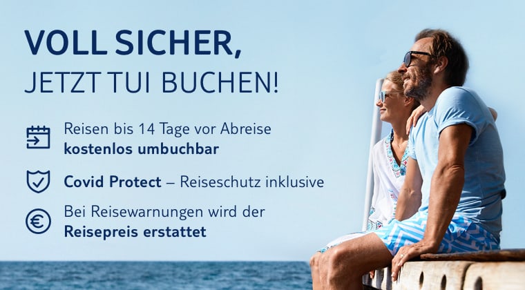 * Das TUI PROTECT Service Versprechen gilt für alle Anreisen vom 01.11.2021 bis 31.10.2023 für alle Pauschalreisen, Hotelbuchungen sowie Rundreisen der TUI Deutschland GmbH inkl. der Marken XTUI, LTUR und airtours sowie für Buchungen von Fly&Mix. (Ausgeschlossen sind die Produkte von TUI Cars, TUI Camper, TUI Ticket Shop, Veranstaltungstickets, VERS[4u], TUI Villas, atraveo, TUI Cruises, airtours private travel und Nur- Flug Buchungen über TUI.com).