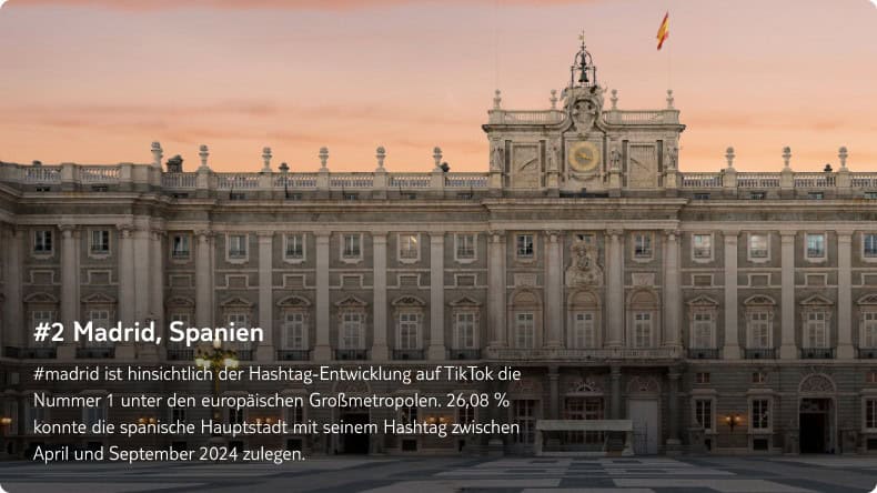Die spanische Hauptstadt verzeichnet den größten Hashtag-Anstieg. Ihre pulsierende Kunstszene, spannende Architektur und das weltberühmte Nachtleben machen Madrid zu einem Magneten für TikTok-Reisende. - Paris, Frankreich – Anstieg um 24,07 %