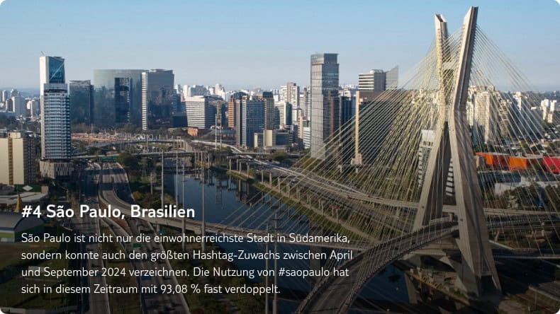 Wir zeigen Dir die beliebtesten Städte weltweit, die bei der Anzahl der Hashtags (Stand September 2024) ganz vorne liegen. Wichtig zu erwähnen ist aber, dass Städte oft mehrere Schreibweisen haben. Wir haben bei unserer Analyse ausschließlich die englische Schreibweise genutzt, um internationale Trends bestmöglich einordnen zu können.
