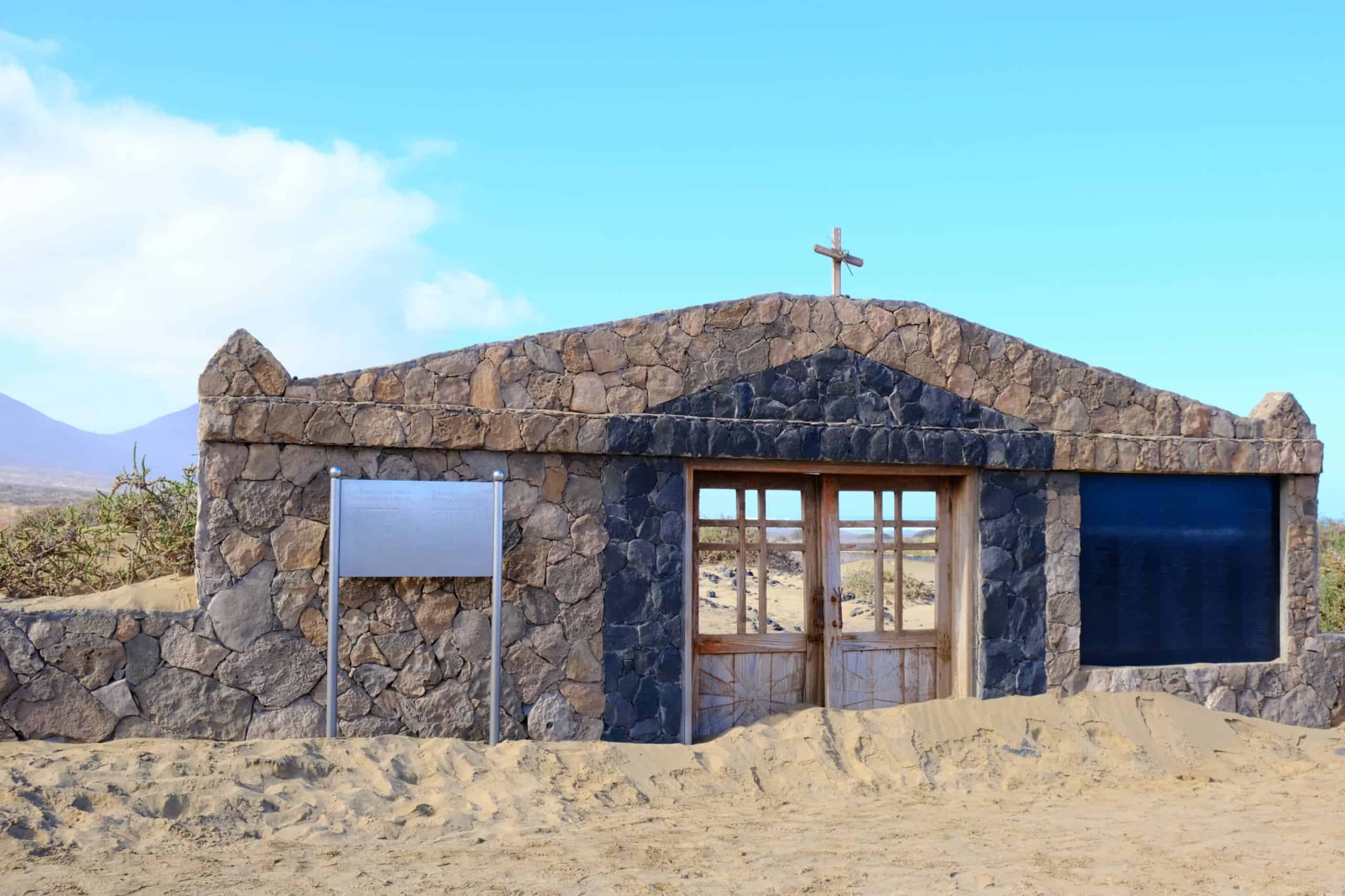 Sandverwehungen haben den kleinen Friedhof am Strand von Cofete fast verschüttet.