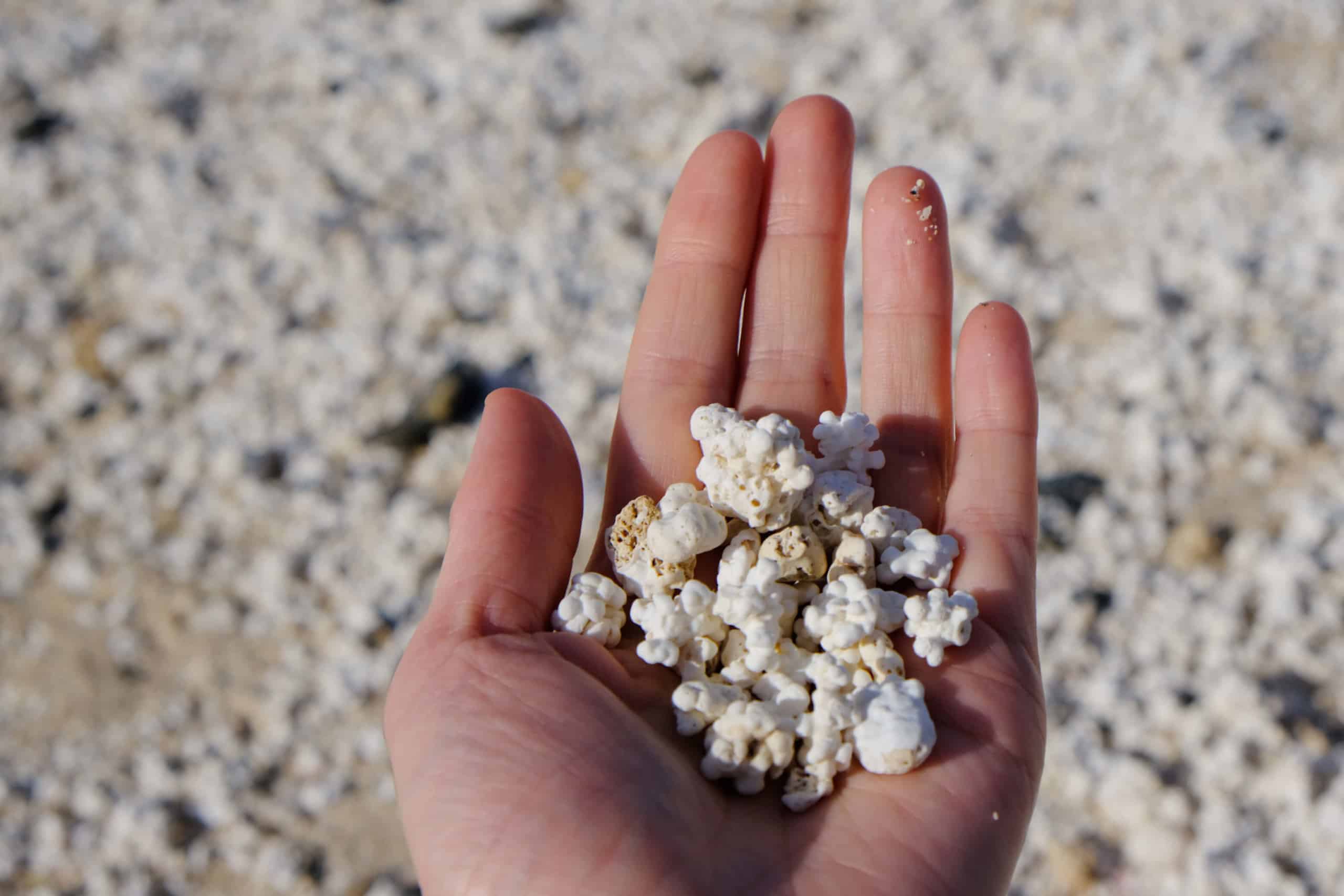 Ein Strand nordwestlich von Corralejo sieht aus, als hätte jemand eine riesige Tüte Popcorn ausgeschüttet. Aber Vorsicht, nicht reinbeißen! Bei dem Naturphänomen handelt es sich um (ziemlich harte) Korallenskelette.