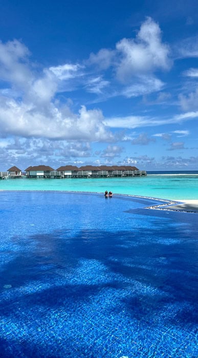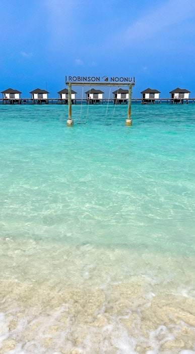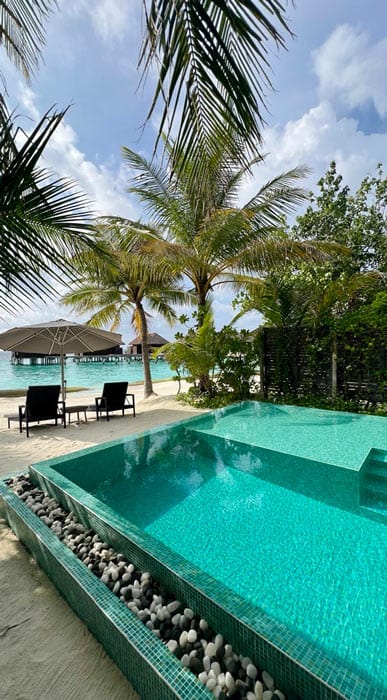 Der krönende Abschluss unserer Tour war der traumhafte ROBINSON NOONU im Noonu Atoll, welches wir per Wasserflugzeug erreicht haben – der Flug war auch noch ein tolles Erlebnis für sich, da wir beide vorher noch nie mit einem Wasserflugzeug geflogen sind. Angekommen auf der schönen Insel, gab es gleich noch eine Besonderheit, denn alle Gäste wurden gebeten, ihre Uhren auf eine andere Zeitzone einzustellen, damit das Tagesprogramm bestmöglichst umgesetzt werden kann – auf jeden Fall ein witziger Fun Fact. Auf dem Weg zu unserem Zimmer sind wir schon an dem schönen Infinitypool vorbeigekommen, in den wir später am Tag dann unbedingt noch abtauchen wollten.