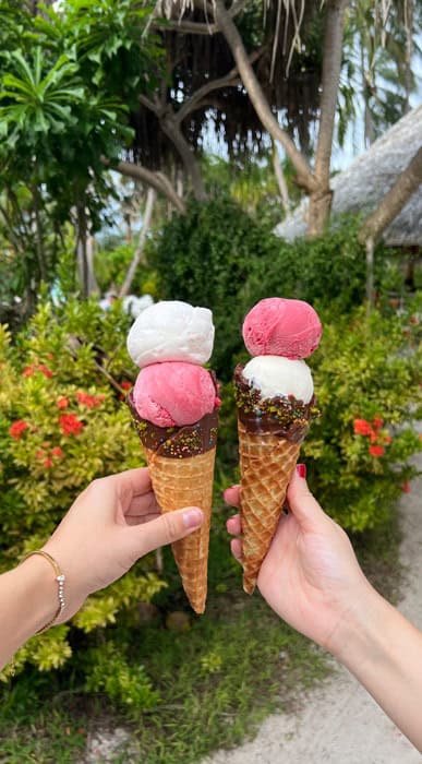 Ein echtes Highlight bei unserem Aufenthalt war unser riesiger Overwater-Bungalow. Wir konnten direkt von unserer Terrasse aus mit einer Leiter ins glasklare Wasser des Indischen Ozeans hüpfen. Momente, die man sich sonst nur erträumen konnte, wurden plötzlich Realität. Ein zweites Highlight war die leckere Eis-Station im Hotel, wo die Waffeln frisch gebacken und mit hausgemachtem Eis gefüllt werden. Mmmh so gut! Und weil alle guten Dinge drei sind, wollen wir euch unser drittes Highlight nicht vorenthalten: Die puderzuckerweiße Sandbank an der Spitze der Insel als das Fotomotiv schlechthin! Von hier aus lassen sich atemberaubende Sonnenuntergänge genießen.