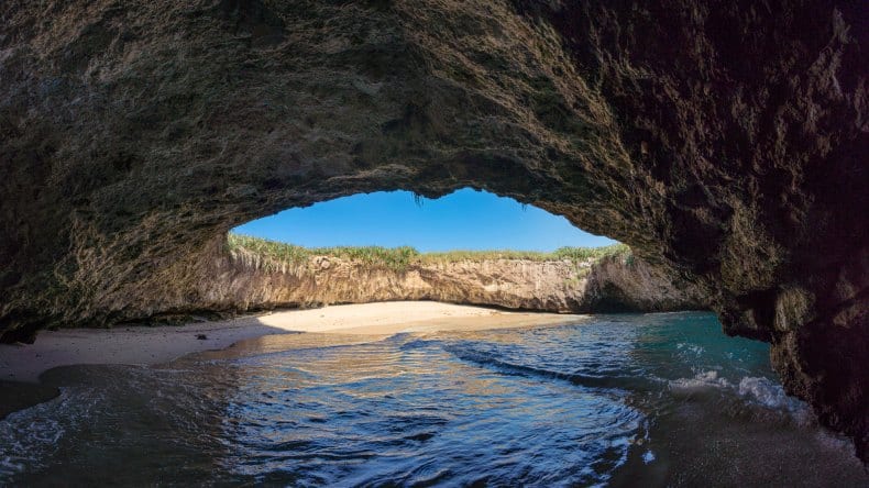Lust auf ein Abenteuer mit Happy End? Dann schnappt euch einen lizenzierten Guide, ein Boot und sucht mit ihm an der Küste von der Marieta-Inselgruppe vor der Westküste von Puerto Vallarta (Mexiko) nach einem Tunnel. Fahrt hindurch und ihr treibt plötzlich vor Hidden Beach oder Playa Escondida auf Spanisch.
