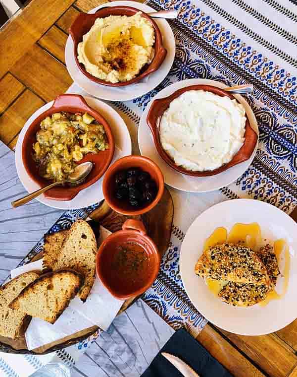 Nach so vielen Eindrücken ist es Zeit für eine kleine Mittagspause. Zurück im Dorf Monolithos kehren wir im Limeri Traditional Guest House ein und bestellen uns leckere Mezes (griechische Vorspeisen), wie Humus, Saganaki Käse mit Sesamhonig und natürlich Brot mit Tsatsiki.