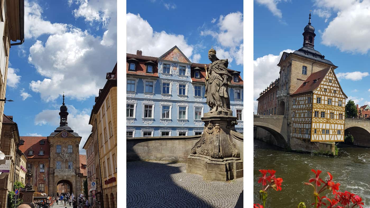 Wenn wir schonmal unterwegs sind in Bayern, dann nehmen wir das jetzt auch noch mit! Gemeint ist die sogenannte „Bergstadt“ Bamberg – ein UNESCO Weltkulturerbe. Ein würdiger Abschluss unserer Rundreise durch Süddeutschland, denn auch hier bekamen wir viel geboten: wunderschöne Hausfassaden, verwinkelte Gassen und einen Blick auf den über der Stadt thronenden Dom.