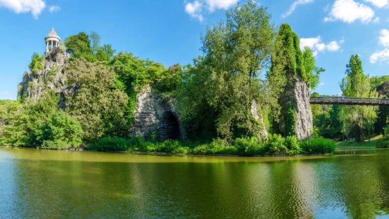 Der Parc des Buttes-Chaumont, gestatltet im Stil eines englischen Gartens, bietet eine wundervolle Umgebung mit kleinen Hügeln, einem See in der Mitte und der idyllischen Insel – Île du Belvédère, die ihr über eine Brücke erreicht. Abseits der Touristenpfade ist der Park ein romantischer Rückzugsort für ausgedehnte Spaziergänge und Picknicks.