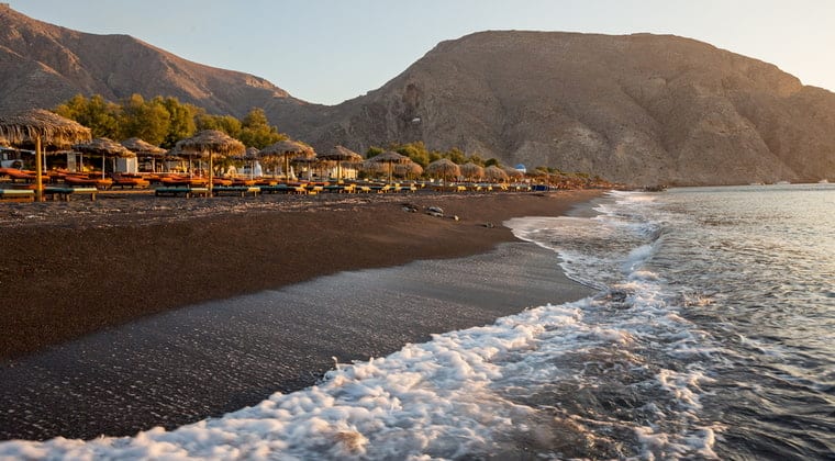 Eine typische Insel für Badeurlaub ist Santorin nicht. Es gibt aber schöne Strände – oft aus Kies oder dunklem Sand, weil die Insel vulkanischem Ursprung ist. Preiswerte Hotels findet man hier nur wenige. Dafür gibt es einzigartige Höhlenhäuser (Cave Houses): perfekt für deinen Honeymoon.