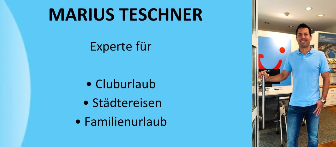 Mein Name ist Marius Teschner. Seit Mai 2024 bin ich im TUI Reisecenter Ricklinger Stadtweg tätig. Ich bin seit dem Jahr 2009 in der Reisebranche. Ich habe u.a. Mauritius, Mexiko, Jamaika, Dom, Rep., Thailand, St. Maarten, St. Barth, die kanarischen Inseln (Gran Canaria, Fuerteventura, Teneriffa, La Gomera, Lanzarote), die Balearen (Mallorca, Ibiza) bereist. Außerdem fahre ich seit 20 Jahren an die wunderschöne Costa del Sol und Costa de la Luz und sehe Andalusien als zweite Heimat an. Darüber hinaus kenne ich die türkische Riviera, Ägypten und Kreta aus eigener Erfahrung. Als Hochseereiseexperte habe ich für Sie u.a. die Mein Schiff 1 von TUI Cruises und die MS Europa von Hapag-Lloyd-Cruises besichtigt. Ausgewiesener Experte bin ich aufgrund meiner vorherigen Tätigkeit für ROBINSON, TUI Magic Life und weitere TUI Konzepthotels wie z.B. TUI BLUE. Ich würde mich sehr freuen Sie in Zukunft persönlich im TUI Reisecenter in Ricklingen begrüßen zu dürfen und freue mich auf Sie.