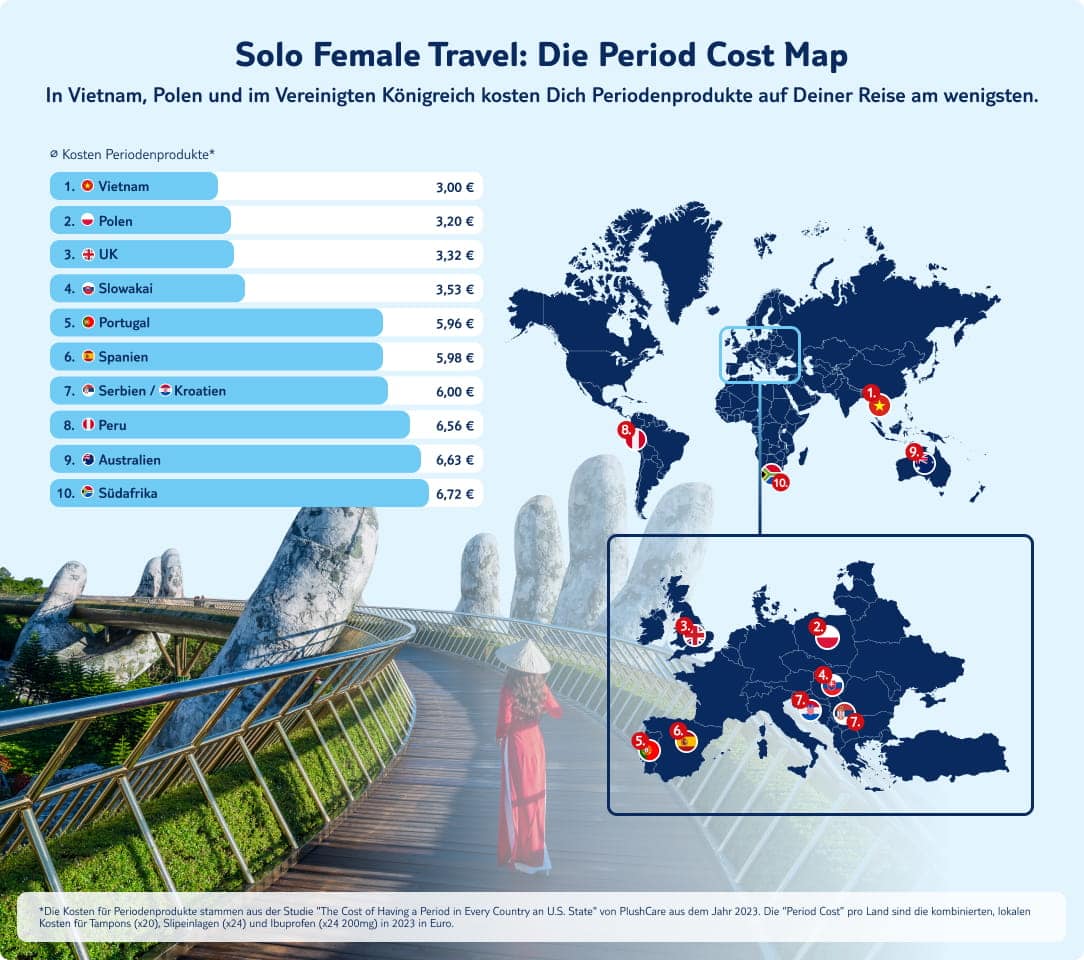 Die Ergebnisse zeigen, dass Vietnam, Polen und das Vereinigte Königreich die günstigsten Länder für den Kauf von Periodenprodukten sind, während Reisende in Australien und Südafrika deutlich tiefer in die Tasche greifen müssen. Neben klassischen Reisekosten wie Transport und Unterkunft lohnt es sich also, auch solche Aspekte zu berücksichtigen, um bestens auf den nächsten Solo-Trip vorbereitet zu sein.