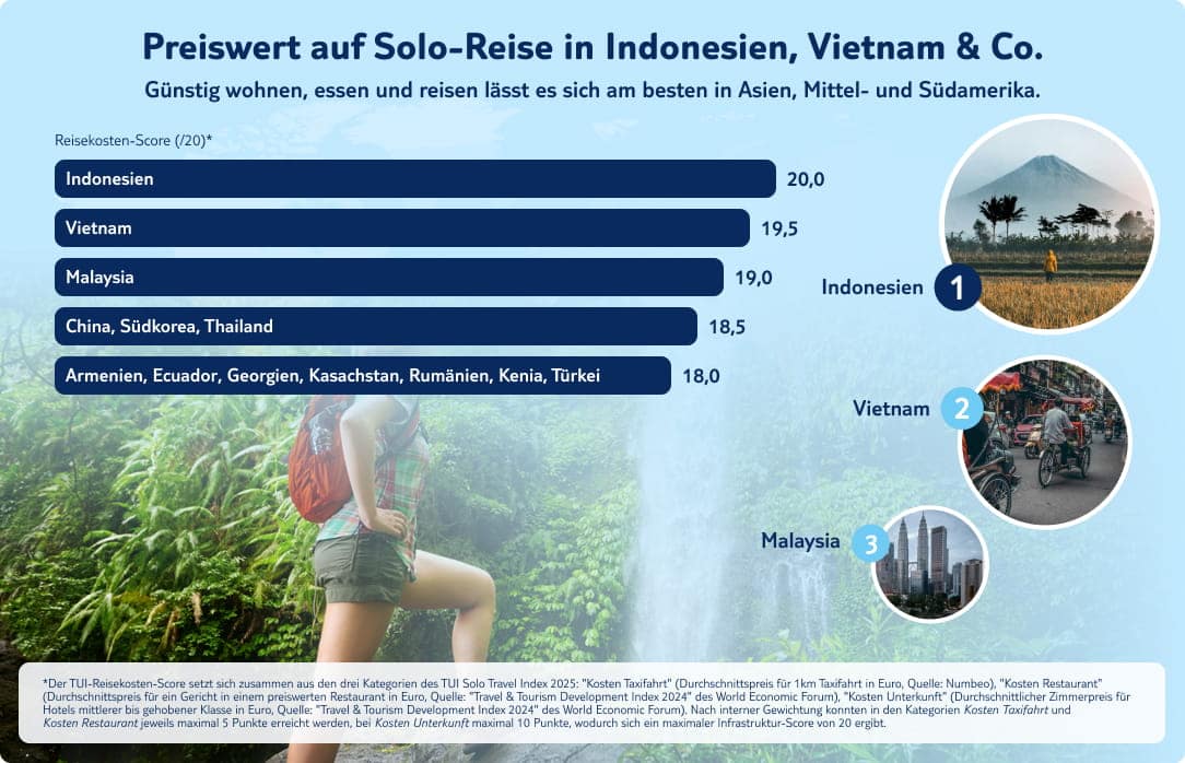 Ob Städtetrip innerhalb Europas oder eine Fernreise ins tropische Urlaubsparadies: Eine Solo-Reise muss nicht teuer sein – der TUI Solo Travel Index 2025 zeigt, wo Du besonders günstig unterwegs bist. Indonesien, Vietnam und Malaysia gehören zu den erschwinglichsten Destinationen weltweit. Diese Länder punkten mit niedrigen Unterkunftspreisen, günstigen Transportkosten und preiswertem Essen, sodass Du Dein Budget optimal nutzen kannst.