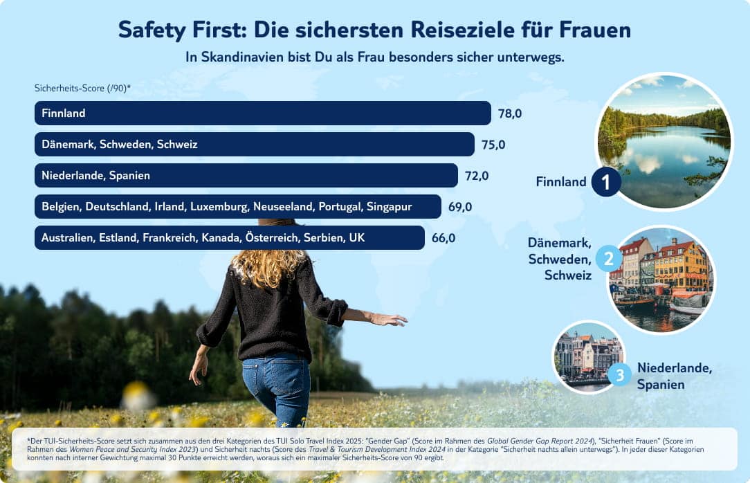 Auch alleinreisende Frauen wollen nach Einbruch der Dunkelheit mit einem sicheren Gefühl das Hotel verlassen können – sei es, um zum Flughafen zu gelangen oder eine Bar zu besuchen. Wenn Du ein besonders hohes Sicherheitsbedürfnis hast, lohnt sich ein Blick auf unsere gesonderte Auswertung, die die Top-50-Destinationen für Solo Female Travel ausschließlich anhand der Gleichberechtigungs- und Sicherheitskategorien rankt und den Sicherheits-Score ermittelt. In diesen Ländern sind Frauen nicht nur gesellschaftlich gleichberechtigter, sondern auch zu jeder Tageszeit besonders sicher unterwegs. An der Spitze des Sicherheitsvergleichs liegt Finnland, während sich der zweite Platz von Dänemark, Schweden sowie der Schweiz und der dritte Platz von der Niederlande und Spanien geteilt wird.